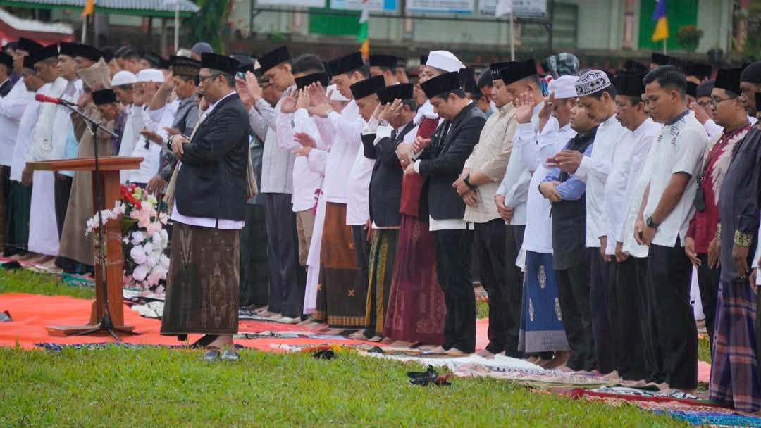 Bengkulu Utara – Bupati Bengkulu Utara, Arie Septia Adinata, S.E., M.AP., menghadiri pelaksanaan Sholat Idul Adha 1446 H bersama masyarakat Kecamatan Padang Jaya di Lapangan Sepak Bola setempat, Jumat (6/6/2025). Kegiatan ini turut diisi dengan penyerahan santunan anak yatim serta bantuan dua ekor sapi dari Pemerintah Daerah Bengkulu Utara.