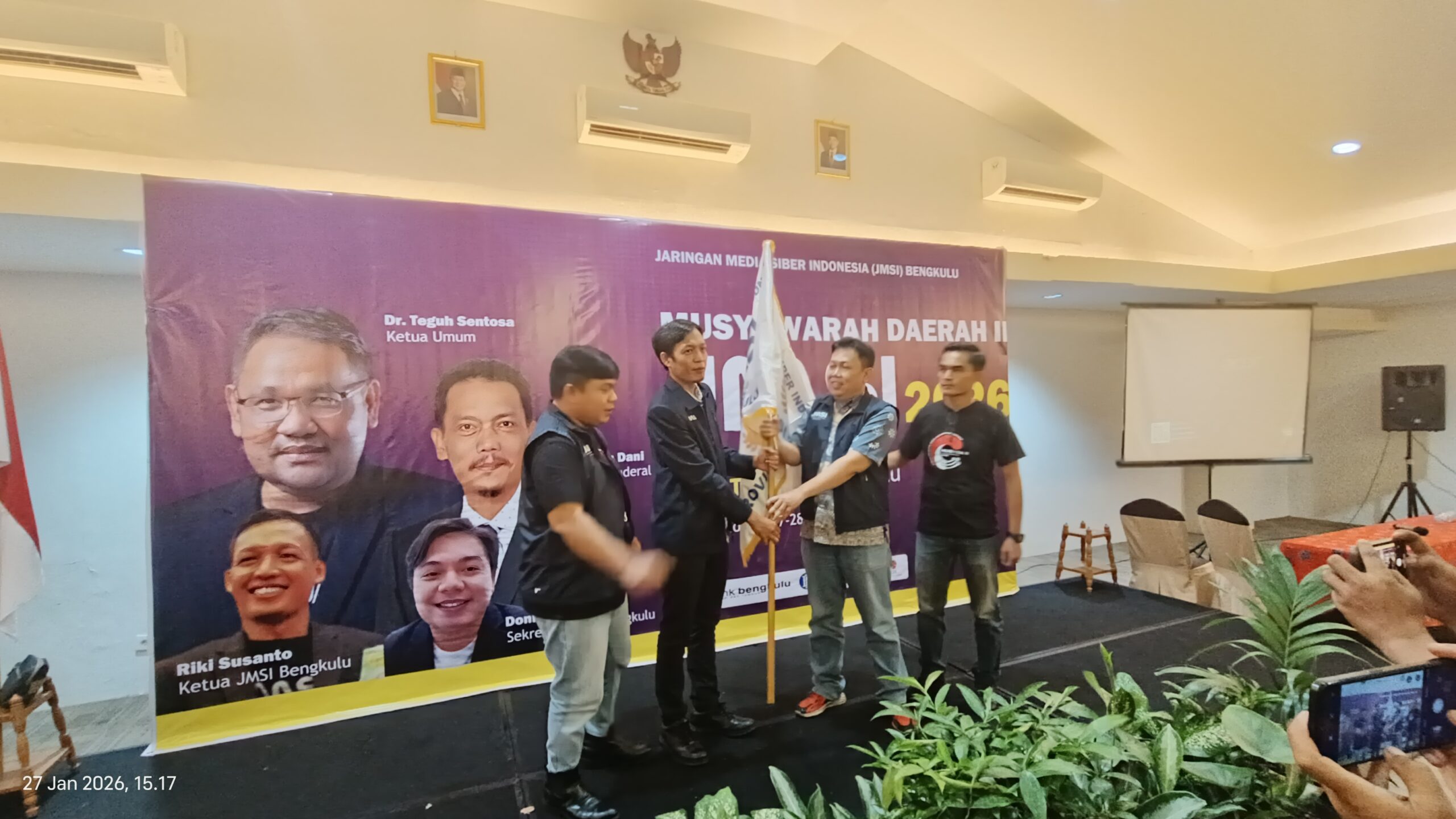 BENGKULU – Sekretaris Persatuan Wartawan Indonesia (PWI) Provinsi Bengkulu, Dedy Hardiansyah Putra, terpilih sebagai Ketua Jaringan Media Siber Indonesia (JMSI) Provinsi Bengkulu periode 2025–2030. Dedy ditetapkan secara aklamasi dalam Musyawarah Daerah (Musda) JMSI Provinsi Bengkulu yang digelar di Aula Hotel Santika Bengkulu, Selasa (27/1/2026).